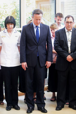 The Queen and her husband, Prince Philip, joined in the silence during a visit to Strathclyde University in Glasgow, while Cameron marked the moment in his Witney constituency northwest of London.