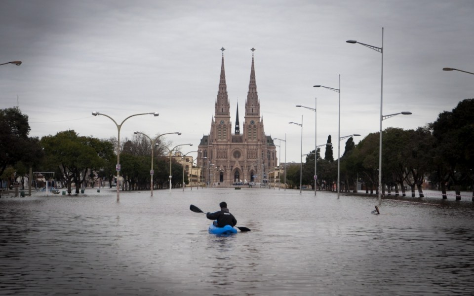 A kayaker paddles towards the Basilica of Our Lady of Lujan in Buenos Aires, Argentina after torrential rains caused flooding in the region over the days prior.
