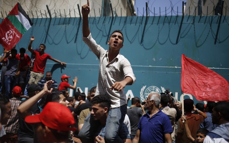 Palestinians take part in a protest against the reduction of educational programs provided by the United Nations Relief and Works Agency outside the UNRWA headquarters in Gaza City.