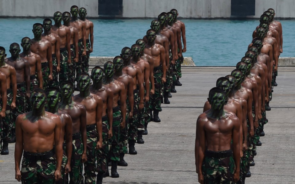 Indonesian troops prepare for the 70th anniversary celebration of the Indonesian Armed Forces.