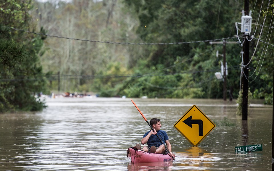 A South Carolina resident kayaks around the flooded streets of Columbia.