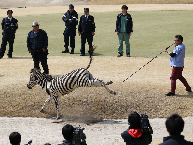 A zebra that was on the loose on a Japanese golf course has died after it was chased around by a dozen men including police officers and shot with a tranquilliser dart before it plunged into a lake.