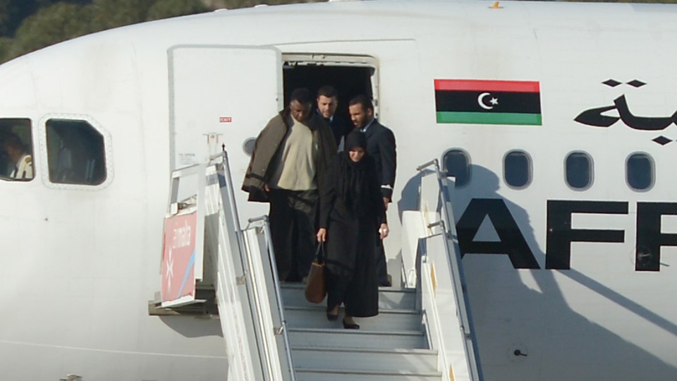 After the passengers had left the plane, a man briefly appeared at the top of the steps with a plain green flag resembling that of Gaddafi’s now-defunct state.