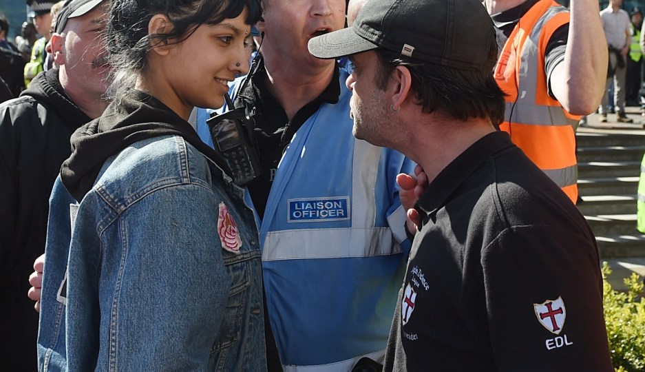 A young woman smiling in the face of intimidating English Defence League (EDL) protesters in Birmingham has become a symbol for the city’s defiance against the far-right.