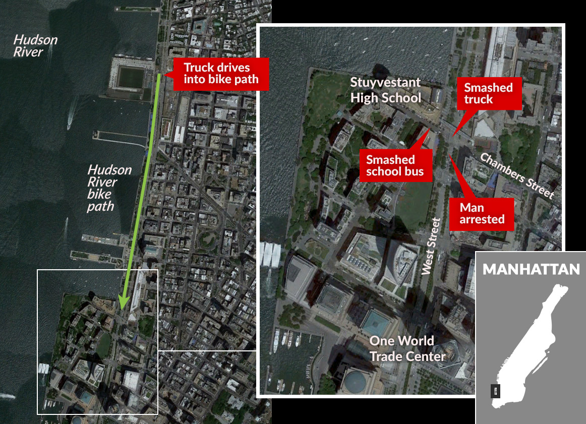 Eight people were killed and more than a dozen injured after a suspected terrorist drove a rented pickup truck along a bike path near New York’s World Trade Centre memorial.