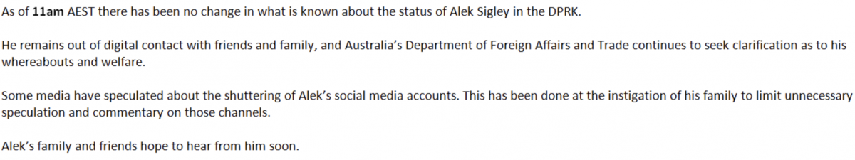 Mr Sigley, a student and tour guide in North Korea, is usually very active on social media, posting regularly and openly about his life as the only Australian living in the secretive dictatorship.