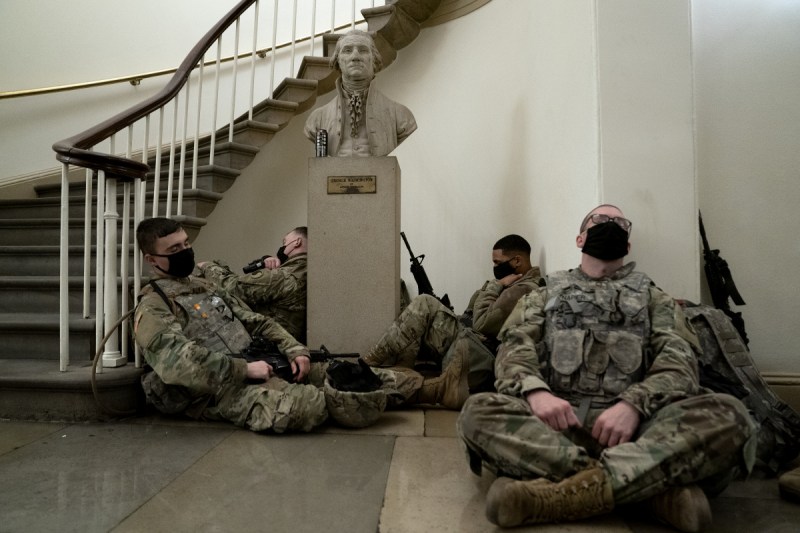 The National Guard is on a 24-hour watch in the US Capitol after last week’s violence, with off-duty members left to catch naps in hallways and below the bust of General George Washington, who led the US to victory in its battle for independence against Britain more than two centuries ago.