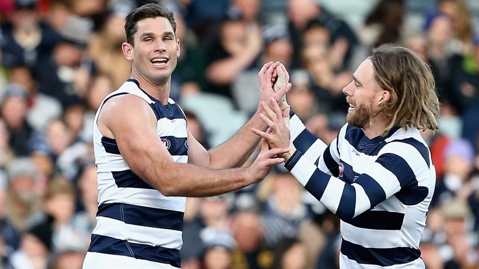 The premiership favourites make up almost a quarter of the 22, with star forward Tom Hawkins on Wednesday night unveiled as captain of the AFL’s team of the year for the first time.