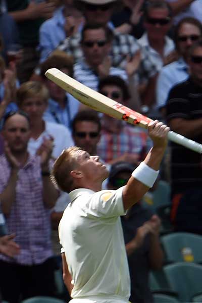 At 61, he swept for two to reach 63, now enshrined as the Phillip Hughes number, the score he had reached for South Australia against New South Wales when that freak situation unfolded. Warner looked to the heavens and the crowd applauded. At 100, he pulled off his helmet, kissed the badge, looked to the heavens and then, almost as an afterthought, launched into his trademark leaping salute. The embrace he shared with captain Michael Clarke is one of the moments of Australian sport. One for the ages.