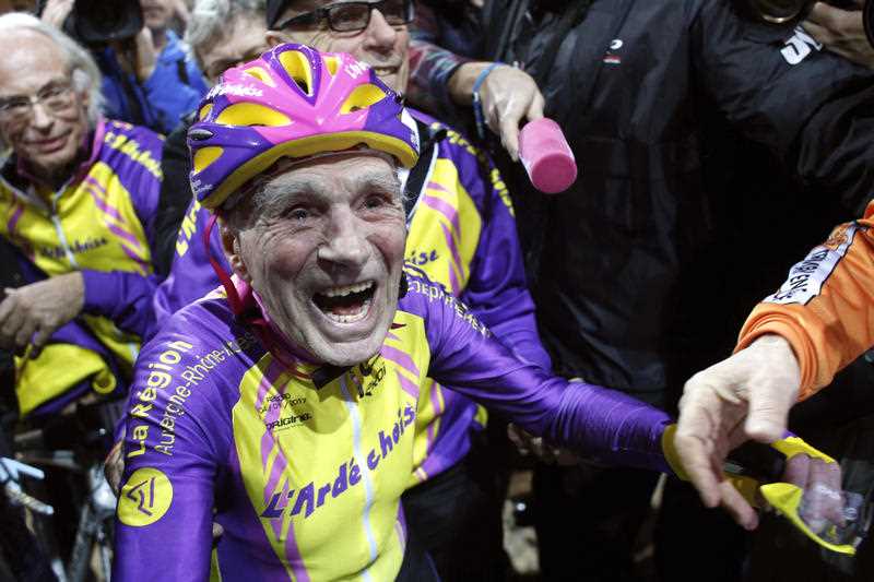 In a skin-tight yellow and violet jersey, the 105-year-old Frenchman set a world record in the 105-plus age category — created especially for the tireless veteran — by riding 22.547km in one hour.