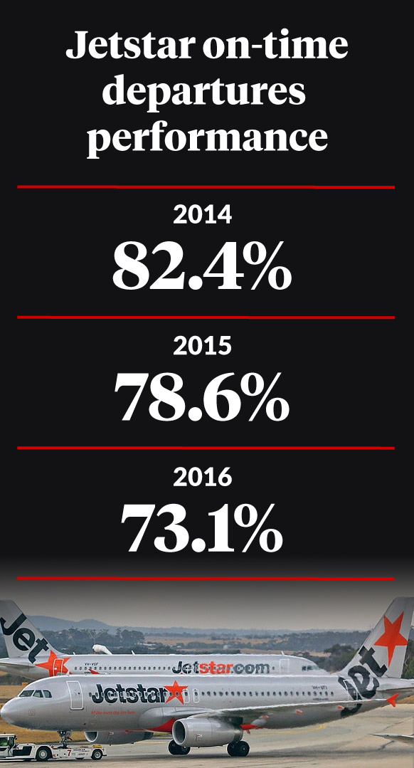 Jetstar’s own performance history also shows its on-time departures have declined from 82.4 per cent in 2014 to 73.1 in 2016, dropping by 5.5 per cent last year alone.