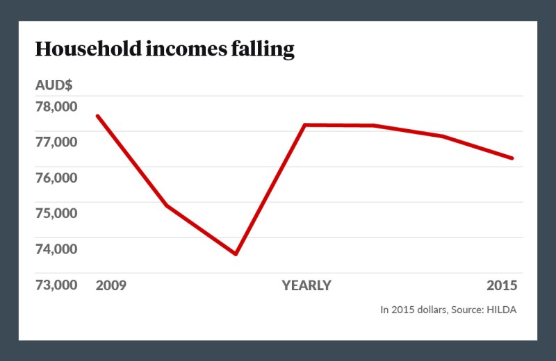 The report also showed something that every retailer in the country probably knows instinctively. Aussie households are actually bringing in less cash in real terms than they were back in 2009 when Kevin Rudd was in The Lodge.